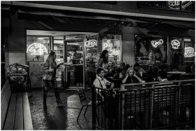 People enjoying nightlife with neon lights in a bustling bar setting.