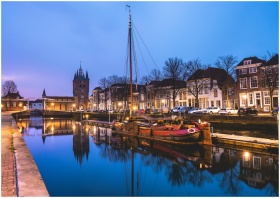 Evening view of the Zierikzee canal with a boat and historic buildings, reflecting a serene urban landscape.