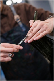 A professional hairstylist cutting hair in a salon, showcasing skilled technique.