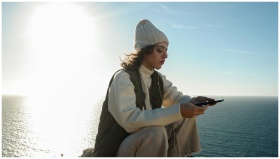 Serene moment of a woman enjoying music by the sea at sunset in Sesimbra, Portugal.