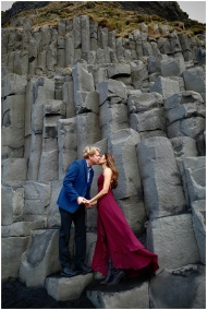 Couple sharing a kiss by iconic basalt columns in Vík í Mýrdal, Iceland.