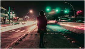 Long exposure night shot of a street in Tepic, Mexico with light streaks and person.