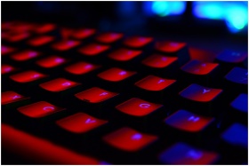 Close-up of a red backlit keyboard, highlighting the vibrant glowing keys.
