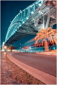 A stunning night scene capturing light trails under an illuminated urban bridge, highlighting vibrant city life.