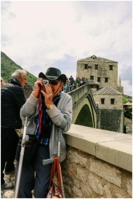 Elderly man with a camera on crutches at the Stari Most bridge in Mostar, Bosnia and Herzegovina.