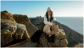 A woman sits on a rocky cliff with a book, enjoying an ocean view in Sesimbra, Portugal.