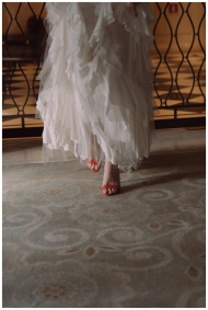 A stylish indoor photo capturing red high heels peeking from under a flowing white dress. Elegant and fashionable.