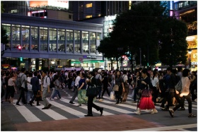 Pedestrians cross Shibuya Crossing, Tokyo at night