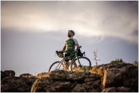 An adventurous cyclist poses on rocky terrain in T