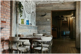 Cozy rustic restaurant scene with wooden decor and cozy seating.