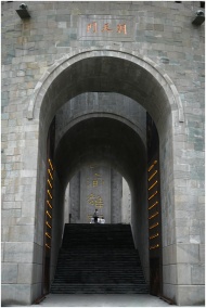 A striking stone archway leading to a grand staircase at a monument in Chongqing, China.