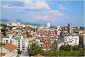 Aerial panoramic view of Split, Croatia showcasing urban architecture and distant mountains.