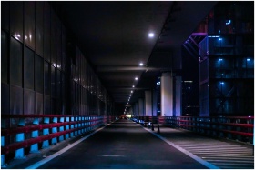 Moody night scene of Chongqing city architecture with vibrant neon lights and empty streets.