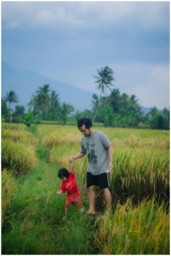 A father and child enjoy a walk through lush rice