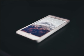 Close-up of a modern smartphone displaying mountai