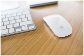 A sleek office setup featuring a wireless mouse and keyboard on a wooden desk.
