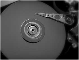 Detailed black and white close-up of an open hard drive, showcasing its mechanical components.