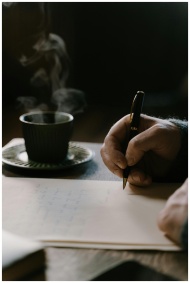 A hand holds a pen over paper with a steaming cup