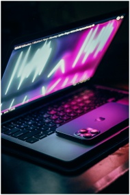 Vibrant illuminated laptop screen with smartphone,