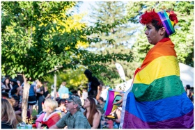 Capturing the colorful energy of a lively outdoor Pride festival with attendees celebrating diversity.