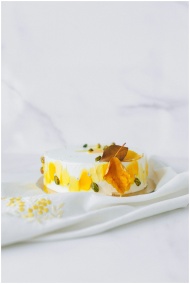 A stylish cake with pistachio and mango accents, perfect for dessert or celebrations.