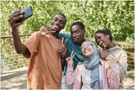 Diverse group of friends enjoying a selfie in a su