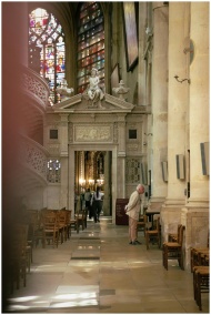 A peaceful interior of a Parisian cathedral featur