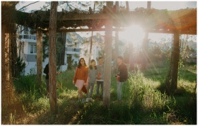 A group of young people enjoying a sunny day in a grassy outdoor area with sunrays filtering through the trees.