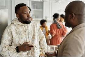 Two friends having a discussion at a casual indoor gathering with others in the background.
