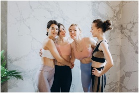 Four women in activewear smiling together, embodyi