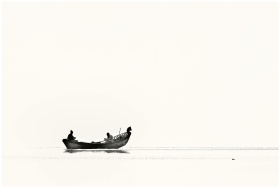 Silhouetted fishermen in a boat on a tranquil water body, showcasing minimalism in black and white.
