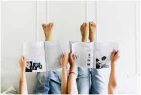 Two people reading magazines upside down in a comfortable setting with denim jeans and a white wall backdrop.