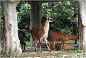 A group of alpacas grazing under a forest canopy, showcasing natural wildlife.