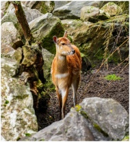 A serene deer stands among rocks in nature, captur