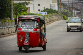 Red tuk-tuk taxi driving on an urban road, showcas