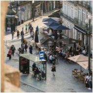A lively street cafe in Porto with people enjoying