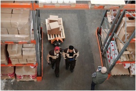 High angle view of warehouse workers organizing and preparing shipments with boxes and pallets.