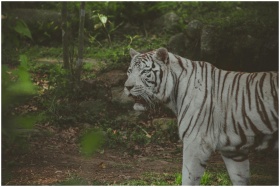 A stunning white Bengal tiger in the wild shows its majestic presence in lush green surroundings.