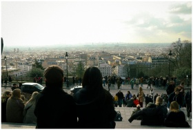 Scenic cityscape of Paris viewed from Montmartre with diverse people enjoying the panorama.