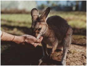 A close-up of a wallaby eating from a person's hand at Lone Pine Koala Sanctuary.