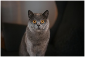 Close-up of a British Shorthair cat with striking brown eyes and gray fur sitting indoors.