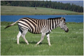 A zebra walks through lush grasslands near a serene lake in Himeville, South Africa.