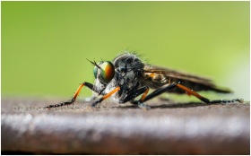 Close-up of a robber fly showcasing intricate details in a natural setting.