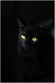 Captivating image of a black cat with mesmerizing golden eyes on a dark background.