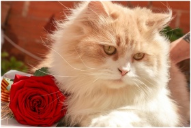Close-up of a fluffy Persian cat with a vibrant red rose, showcasing elegance.