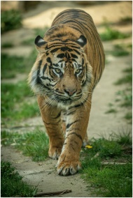 A powerful Bengal tiger strolls confidently on a forest path, showcasing its majestic stripes.