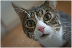 Adorable close-up of a curious domestic cat with vibrant eyes and whiskers.