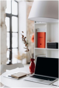 Stylish minimalist home office setup with a laptop, red vase, and decor on a white table.