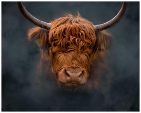A captivating close-up of a Highland cattle with misty backdrop, showcasing its long horns.