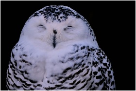 Serene snowy owl with closed eyes against a black